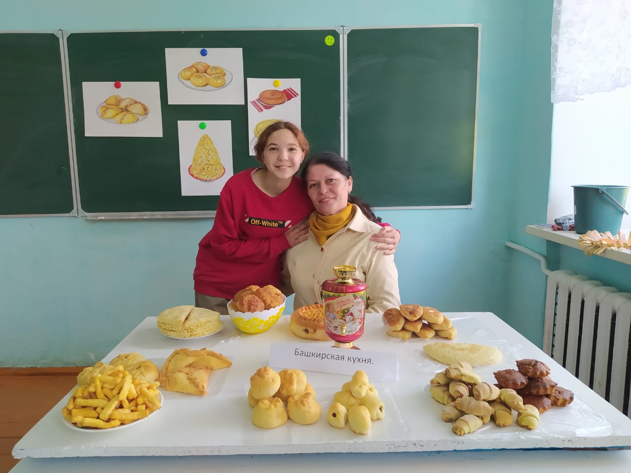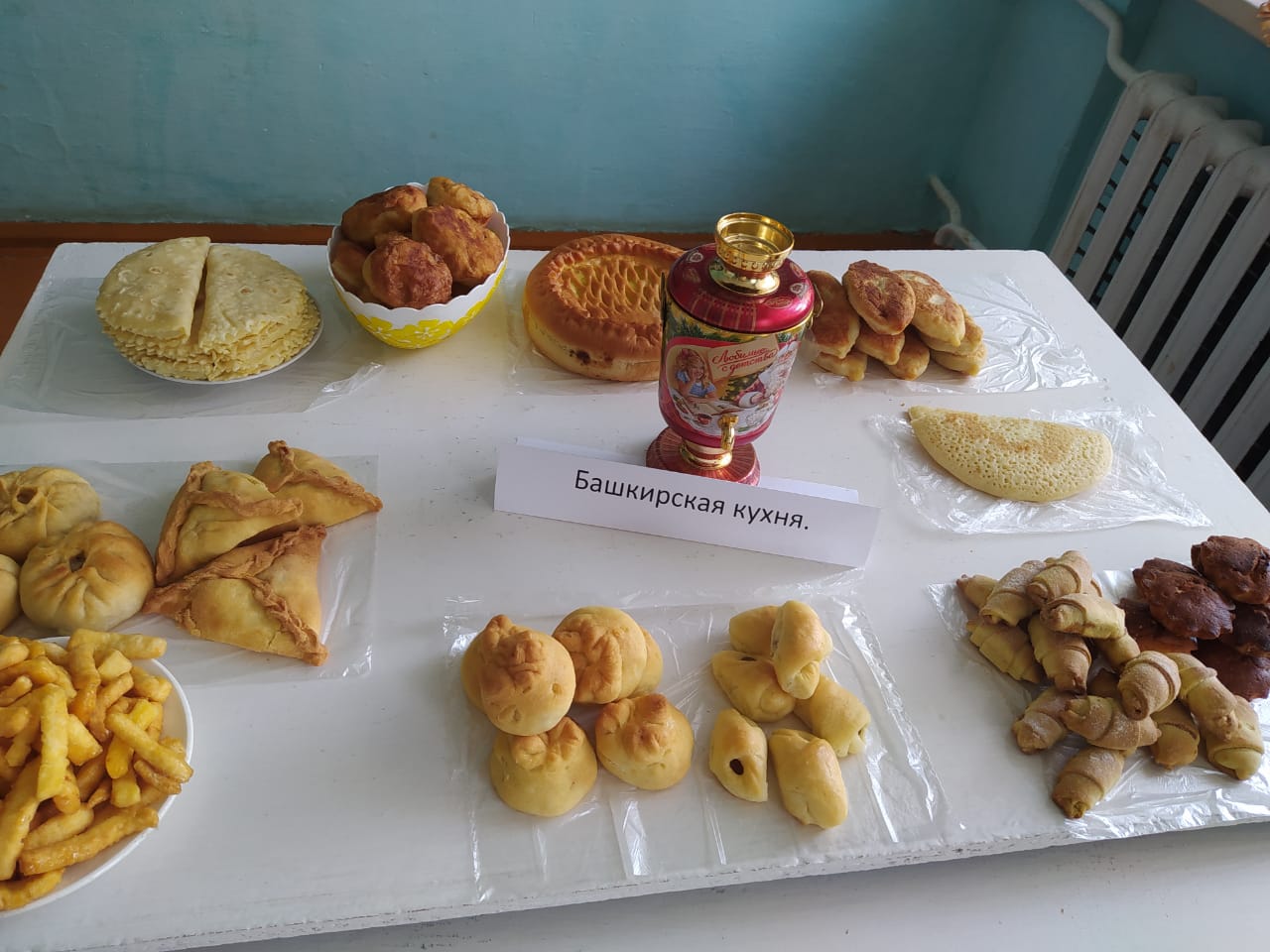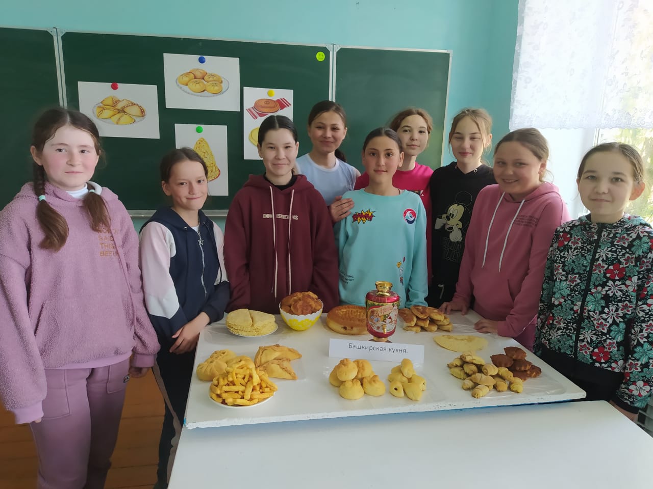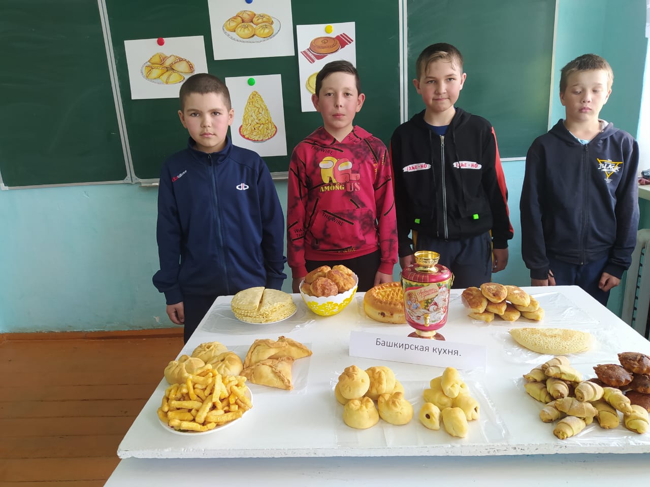 Башкиры — народ, населяющий достаточно большую территорию на Южном Урале. В древности он вел полукочевой образ жизни, перемещаясь в теплое время за отарами овец и табунами лошадей с пастбища на пастбище, а в холодное — устраивая зимовки в деревнях. Естественно, образ жизни наложил отпечаток на национальный уклад: фольклор, развитие ремесел и, конечно, кулинарные пристрастия. В Башкирской кулинарии славиться блюдо «Бешбармак», «Эчпочмак», «Чак-чак», «Беляш», «Тукмас».. Учитель башкирского языка Максютова З.М. проводила урок на тему :" Башкирская национальная кухня"