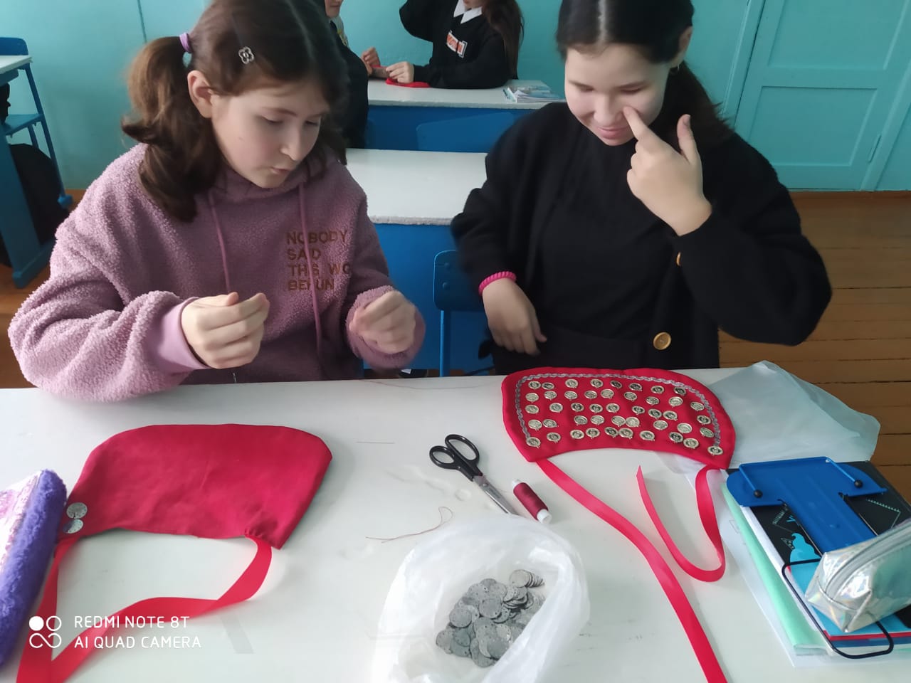 Башҡорт теле уҡытыусыһы Мәҡсүтова Зөлфиә Миҙхәт ҡыҙы алтынсы класс уҡыусыларына түшелдеректең тарихы һәм башҡорт ҡатын –ҡыҙҙарының тормошонда уның әһәмиәте тураһында һөйләне.Түшелдерек үҙенсәлектәрен аңлатҡас уҡыусылар , ҡыҙҙар бик теләп , тырышып эшләнеләр. Һаҡал –ҡатын-ҡыҙҙың аҫтан түңәрәгерәк итеп, уртаһына шау тәңкә , ситенә мәрйен баҫып яһалған күкрәк биҙәүесе.