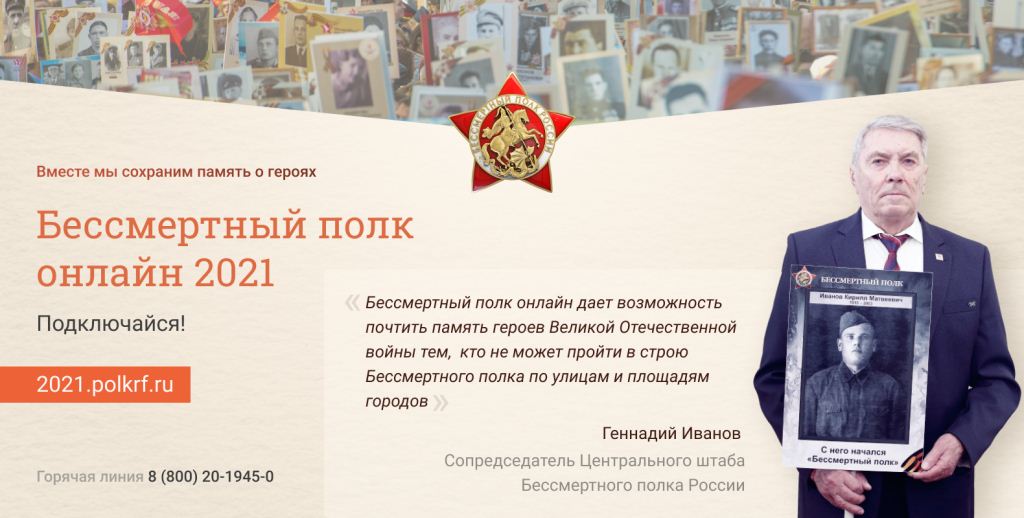 «Бессмертный полк онлайн» дал возможность нашим соотечественникам со всего мира почтить память дедов и прадедов, которые сражались в ту страшную войну. В 2021 году можно принять участие в онлайн-шествии, зарегистрировавшись на сайте 2021.polkrf.ru